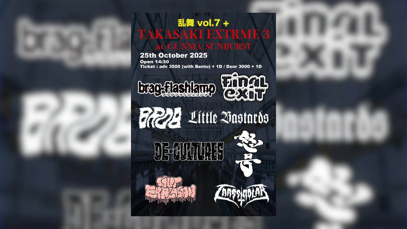 On October 25th, 2025, Gunma Sunburst hosts a joint showcase of brutality: Takasaki Extreme 3 collides with 乱舞 (Ranbu) Vol.7, fusing chaos from across Japan’s hardcore, grind, and extreme punk scenes. The result is a floor-stomping, throat-shredding, absolutely unhinged gathering in the heart of Gunma — all happening inside one of Japan’s loudest steel-box venues.